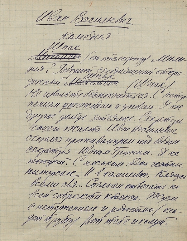 Единственное исправление на первой странице «Ивана Васильевича» показывает переход от одной пьесы к другой. Герой «Блаженства» Михельсон появляется в пьесе «Иван Васильевич», а затем Булгаков придумывает краткую и звучную фамилию Шпак, записывает ее в скобках после «Михельсон» и позже решительно вычеркивает из текста первый вариант.
