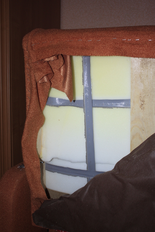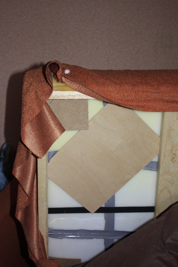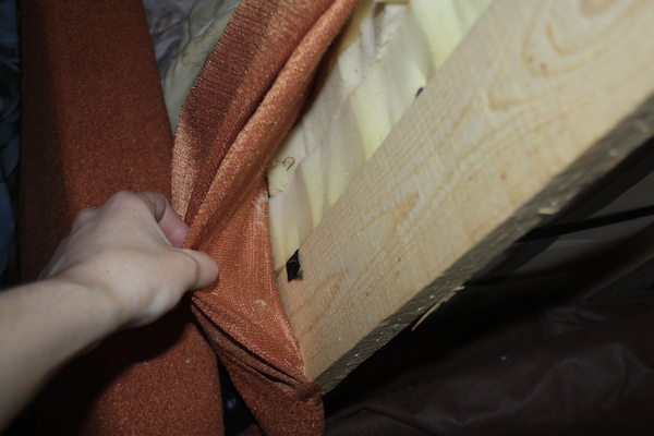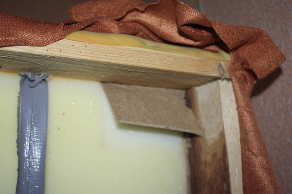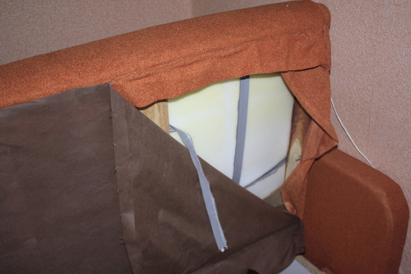 А в уголках обнаружились заботливо вставленные квадратики фанерки (пардон за отсутствие фокуса), продавленные весом сидевших, и в качестве эксперимента в диванье нутро была временно засунута имевшаяся деревяшечка размера А4, что очень положительно сказалось на его функционале, так что в следующий раз, при необходимости чинить этого инвалида, буду сразу искать фанерку во всю длину подушки.