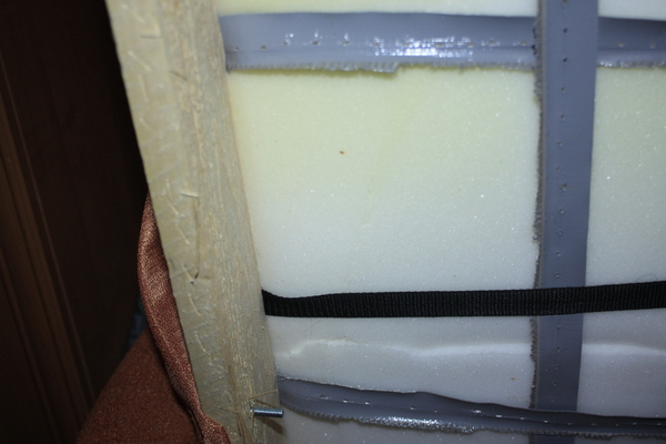 Нижняя "обивка" держится на скобах, снимается легко. И обнаруживается причина провисания поролона - порвались "ленточки", поддерживавшие его. Чтоб их.