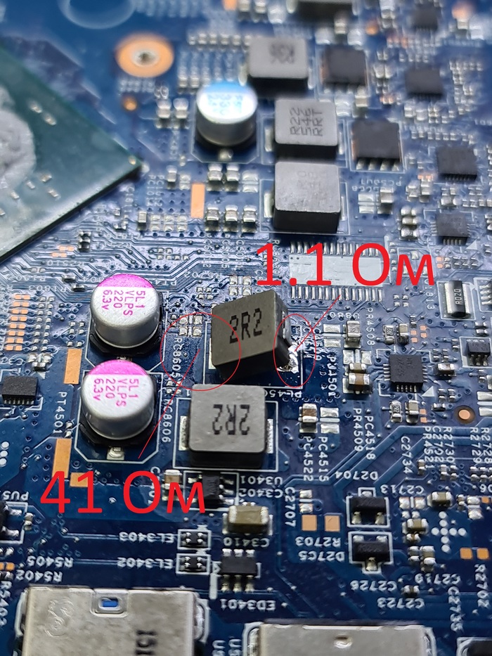 Сопротивление кОм'ы - норма. Дальше нужно разобраться с 1 омом со стороны ШИМ, его сразу снимаю - будем менять, а 1 Ом так и висит, собственно остались тут только два N-канальных транзистора 8067H и один из них пробит (отмечен красным) во все стороны и весело звенит сток-исток-затвор: