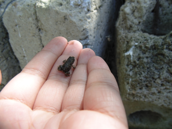 Вот там между блоками эти малявки прячутся от жары. При съемке ни одного лягушонка не пострадало, все они спокойно попрыгали дальше по своим лягушачьим делам.