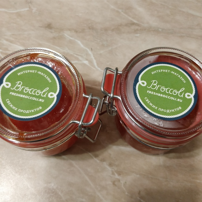 Заказал на сайте фирмы,"Брокколи" две банки икры, одну на новый год, вторую,, на поесть,, с доставкой на вечер. Стоимость обоих банок - почти 2500 рублей. Вежливый курьер вечером привёз красивые стеклянные баночки, на каждой на дне было написано название, от какой рыбы икра. Отдав деньги, расписался в накладных, аж в двух экземплярах, и проводив курьера, в ожидании гостей, накрыл столик и сделал пару бутербродов с икрой,, горбуши,