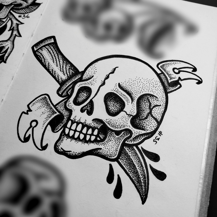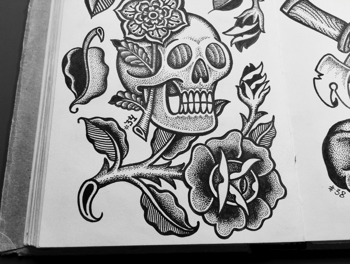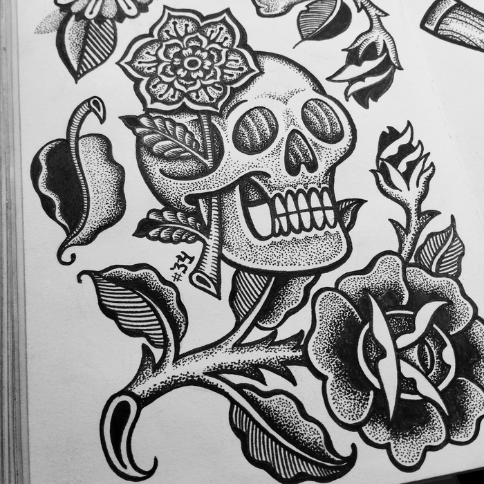 Тоже череп-и-цветочки, но тут всё по олд-скулу. Люблю вот этот всратый графический стиль олд-скул тату)