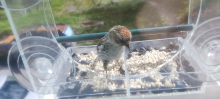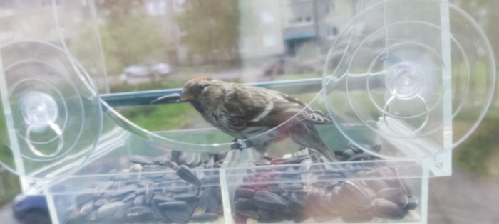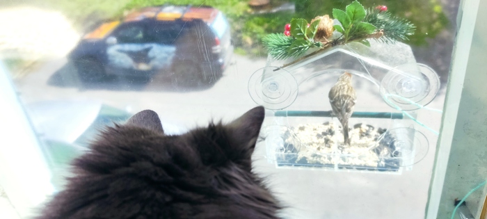Поначалу никто не прилетал и затея казалась провальной. Оказалось птиц можно приманить прикрепив на кормушку веточку с ягодами. Часть окна заклеили светоотражающей плёнкой и теперь кошки могут сидеть в притык не беспокоя пернатых.
