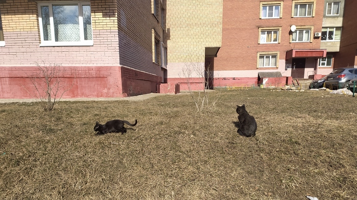Мама-кошка опять уселась на солнышке, а котёнок начал носиться за летающими на ветру листиками мусора и деревьев.