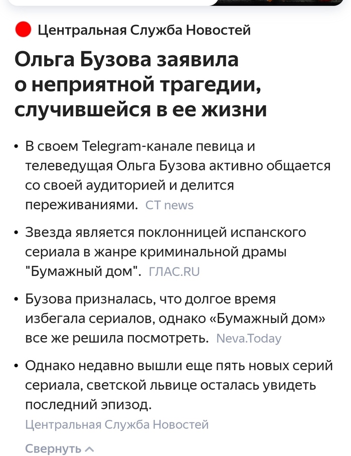 "36-летняя поющая ведущая поделилась в своем Telegram-канале неприятностью, произошедшей в её жизни. Звезда является поклонницей испанского сериала в жанре криминальной драмы «Бумажный дом». Она призналась, что не смогла досмотреть его из-за того, что очень сильно хотела спать.