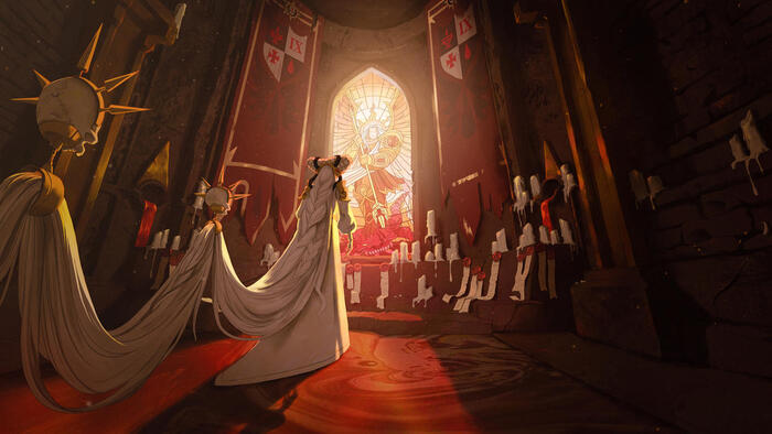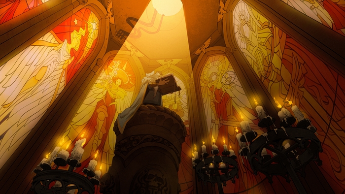 На витражах слева-направо: Святая Эуфратия, Святая Целестина, Святой Gerstahl, Алисия Доминика и сам Император человечества.