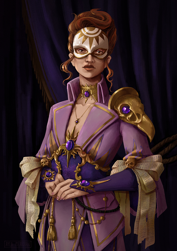 Seraphina пред витражом с изображением Сангвиния.