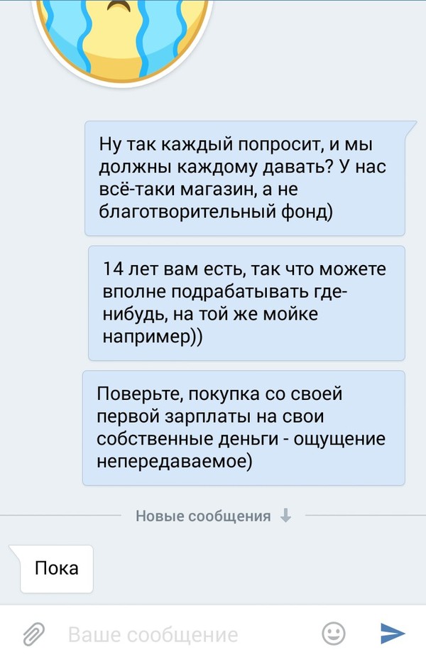 1905 Sova1998 Когда ещё не знаешь цену деньгам 9 лет назад Мой первый пост на Пикабу, так что не судите строго) Если понравится, то выложу ещё из подобной тематики из личного опыта, там много весёлого.Думаю комментарии к фото излишни (возраст взял с его страницы)Коммент для минусов внизу Показать полностью 2 [моё] Интернет-магазин Дети Деньги Халявщики Длиннопост
