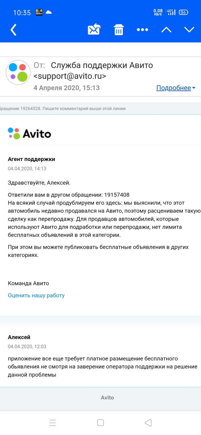 Казалось бы ну и хрен с ним заплатил не столь большую сумму и избежал геморроя (на это наверное и рассчитывают) но так как я человек вредный и дотошный люблю порядок да и сумма не 500 рублей стал вопрос за что? Новые правила или Авито стал платным проштудировав выяснил ,что нет так же есть категория бесплатное и мое объявление так же из разряда бесплатных так как же так то? Звоню в поддержку где меня уверяют ,что это ошибка и в течение суток ее устранят сутки прошли не чего не произошло решил написать в этот раз в электронку сдесь уже был ответ иным.