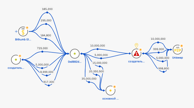 На него же и осуществлялся вывод с партнерской проекту (известно_скамерской) биржи Bithumb – всего выведено с биржи 2,2 млн USDT.