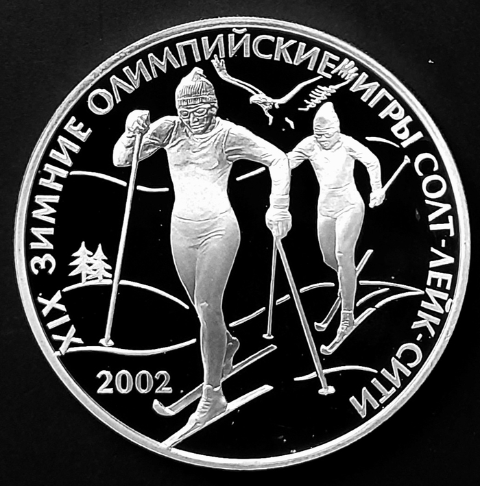 Эта монета выпущена в 2002 году в в честь XIX зимних Олимпийских игр в Солт-Лейк-Сити (США). На монете изображены две лыжницы, бегущие друг за другом, парящий орёл.