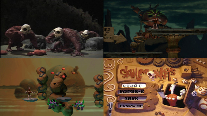 Skullmonkeys - это хороший, великолепный в своей среде платформер и по совместительству продолжение нашумевшего квеста The Neverhood. Вы наверняка захотите спросить: "Но ведь The Neverhood вышел также на первой "Соньке", почему бы не начать рассказ именно с первой части?" А я вам отвечу, что сказать мне пока банально нечего. Я вообще хочу попробовать пройти многие игры с персонального компьютера, которые были, есть и останутся одними из лучших в игровой индустрии (особенно квесты, многие из которых таки посетили нашу "старушку" PS1), но пока руки до них всё не доходят. У меня комп вообще забит под завязку эмуляторами, ROM'ами, образами игр на Playstation, ещё надо там PS2-игры проходить, плюс иногда поигрываю я в NES и Sega Genesis, поэтому времени пока ни на что не хватает. Но я доберусь до неё, поздно или рано, и выскажусь о ней детально, подробно, потому что игра заслуживает такой детальный разбор.