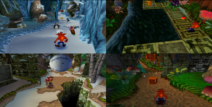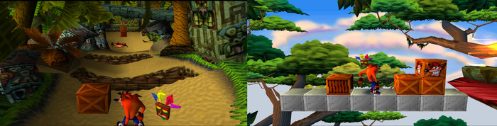 Начать раздел, наверное, надо с довольно знаковой серии видеоигр, первое время посещавшей только старушку PS1, то есть с Crash Bandicoot. Незамысловатый на первый взгляд платформер захватил умы и сердца геймеров тех лет за счёт того, что он банально выступал в роли крутой технодемки. В нём был хороший визуал: тропические джунгли, водопады и скалы умещались в четыре, а то и даже три полигона.