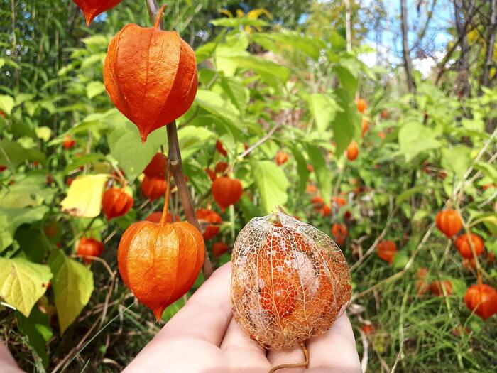 Я привёз веточку физалиса в квартиру, он со временем высох и стал как китайские фонарики из жёлтой бумаги, но не стал таким ажурным, как чехлик на фото. (Не ругайте за слово "чехлик", я его не выдумал, а взял из статьи в Википедии "Физалис")