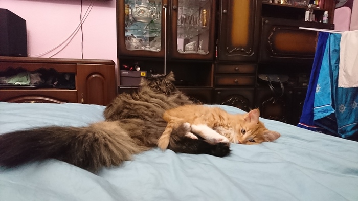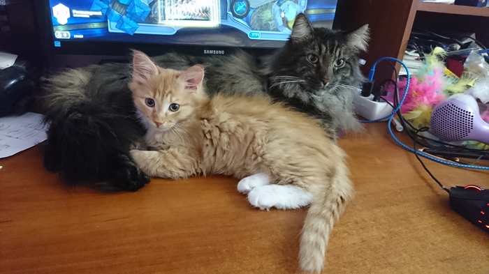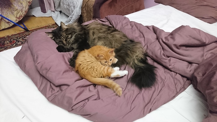 Подруга раздавала трех рыжих котят, с мужем напросились в гости, потискать, пока их не забрали. В итоге ушли втроем с мурчащим комком. Дома ждал взрослый кот, который сразу принял на себя все функции родителя: вылизать, уступить миску, не сердиться, когда кусают за хвост и прочие части тела, смиренно терпеть, когда роются в пузе, ища молоко. Малыш по пятам ходит за "папкой" и ласково мурлычет, пристраиваясь к мохнатому боку на сон.
