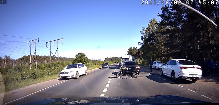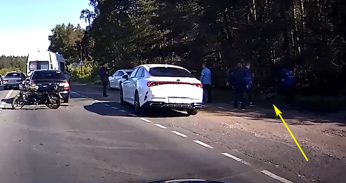 Сегодня утром этот любитель езды по обочине сбил мотоциклиста в том же месте. Мотоциклист жив, на фото/видео справа, на траве, в тени лежит (рядом медик)