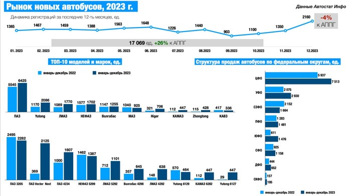 Друзья, привет! Начало нового года – время подводить итоги прошедшего. Начнем с рынка новых автобусов всех классов. В 2023 году в стране поставлено на учет более 17069 новых автобусов разных классов. Это на 26% больше, чем в 2022 году.