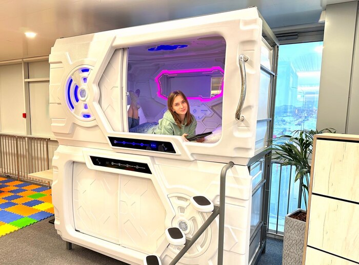 Каждая капсула оборудована USB-зарядкой, местом для хранения багажа, а также шумоизолирована для комфорта отдыхающего.