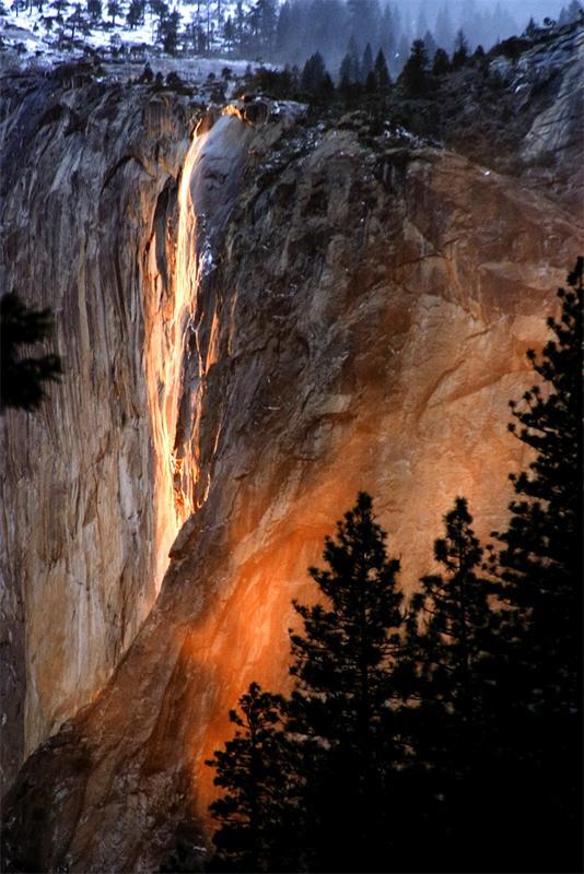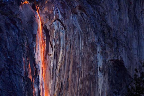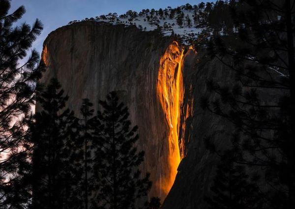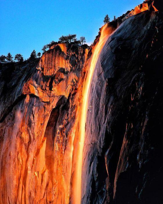 Этот удивительный водопад под названием «Лошадиный Хвост» расположен в национальном парке Йосемити в Калифорнии, США. Его основной особенностью является то, что при определенном угле падения солнечных лучей, водопад становится похожим на поток лавы, который стекает с вершины горы. Очень красивое и необычное природное явление.