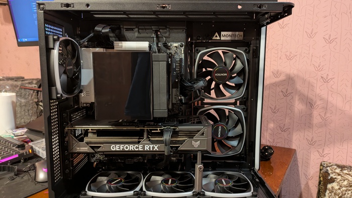 Собственно финальный вид. Смотрится потрясающе, место в корпусе достаточно, что бы циркулировал воздух и видюха не грела проц. На дисплее кулька можно увидеть температуру процессора, при запущенной на миссии "Helldrivers 2", все настройки на ультрах. Сразу отвечу на вопрос, почему не водянка? Да просто не хочу, двухбашенного кулька со 120 винтами вполне хватает. Пол часа гонял на бенче и температура держалась в пределах 71-72°, что для такого камня более чем с запасом. Самый пик температуры был замечен в момент загрузки локации в "Monster hunters wilds" до 83°. Температура камня поднялась очень быстро с 64° и так же быстро до неё опустилась. Настройки также на ультрах. Системник потянет люблю современную игру и ещё с запасом на несколько лет, 3-4 года думаю точно хватит. Выбирал так, что бы в дальнейшем можно было апгрейдить и думаю, что первая под замену пойдёт видюха, проца на долго хватит.