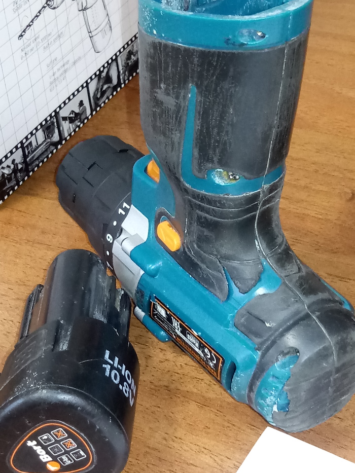 Выпуск 03.2017, сильно б/у, "следы эксплуатации"- рваное резиновое покрытие, сломана защелка на аккумуляторе, ржавчина и грязь в посадочных местах крепежа.