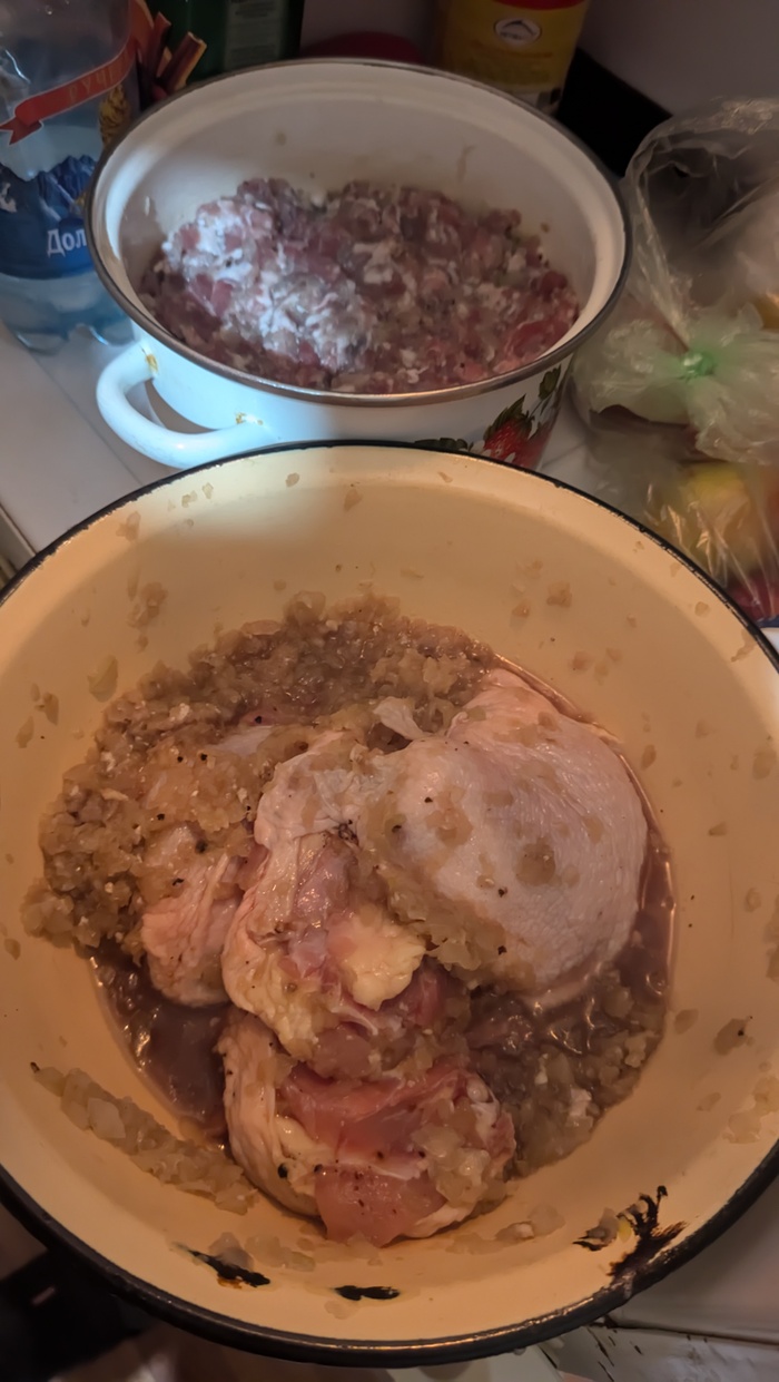 В маленькой кастрюльке-будущие пельмени..Я хз как их лепить завтра.. в 50-лет..Хлеб вроде научился готовить..хороший..а это говно проще в лаваш закатать..