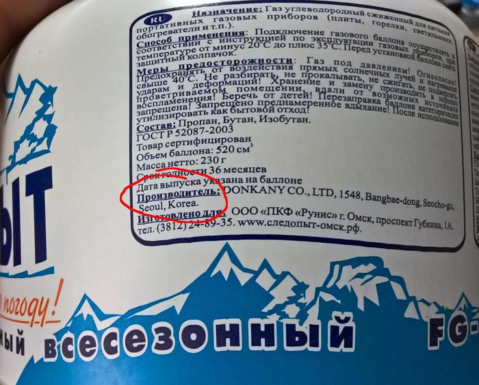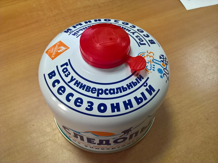 Пошел в ближайший магазин, где продается туристическое снаряжение. Выбор газа оказался небольшим: корейская Kovea и наш газ с названием "Следопыт". Вдохновленный идеей импортозамещения, взял "Следопыт": и дешевле, и национальное достояние, как-никак. Взял небольшой баллончик 230 г за 245 рублей. Вот он: