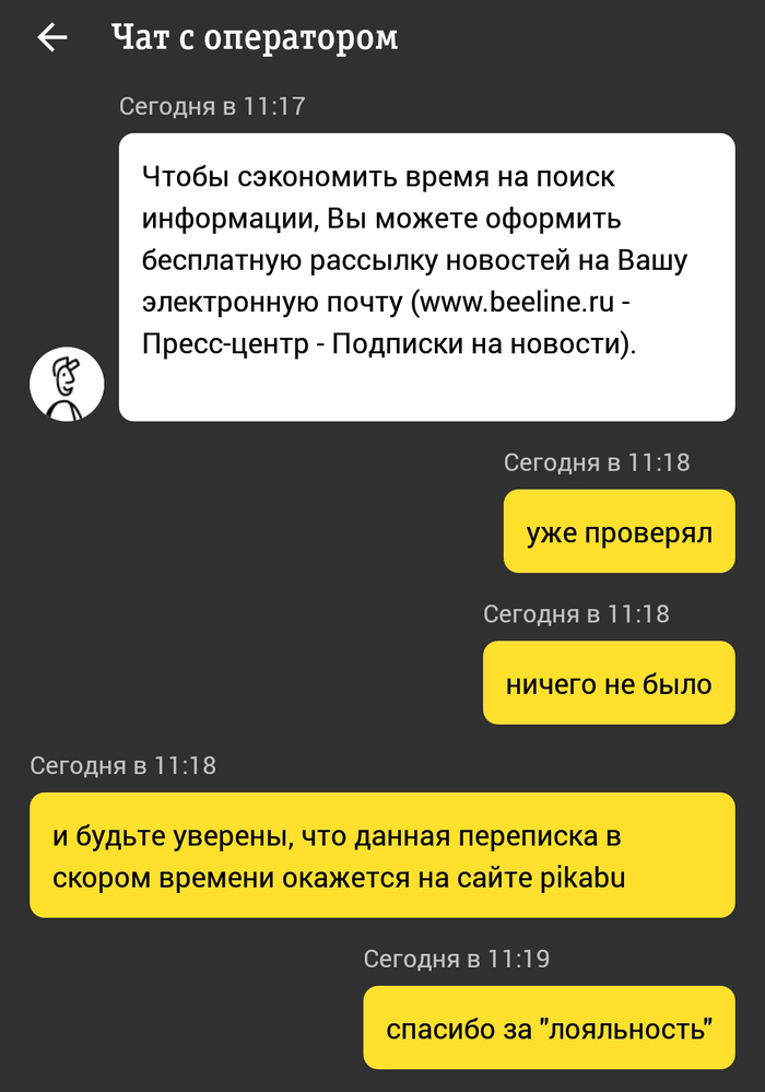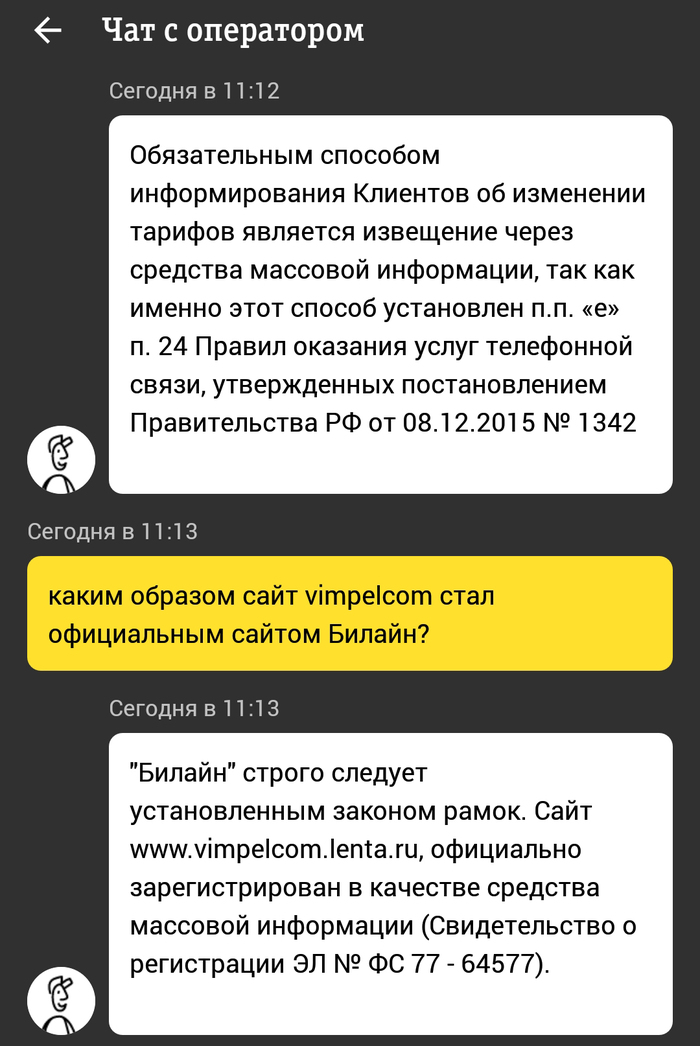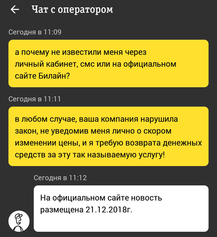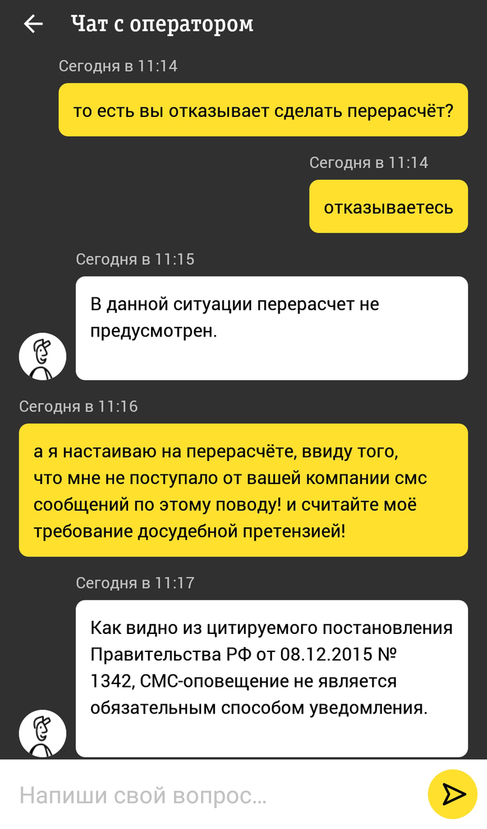 Зная, что эта услуга всегда была бесплатной, иду в чат с оператором, чтобы попробовать вернуть вроде как и небольшие, но все же свои, честно заработанные (в отличие от этого ОпСоСа) деньги. Далее, как говорится, без комментариев.