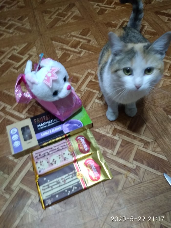 Мелкая в восторге, котик немедленно признан любимой игрушкой, вкусняшки почти съедены. Большое спасибо нашей снегурке из Подольска!