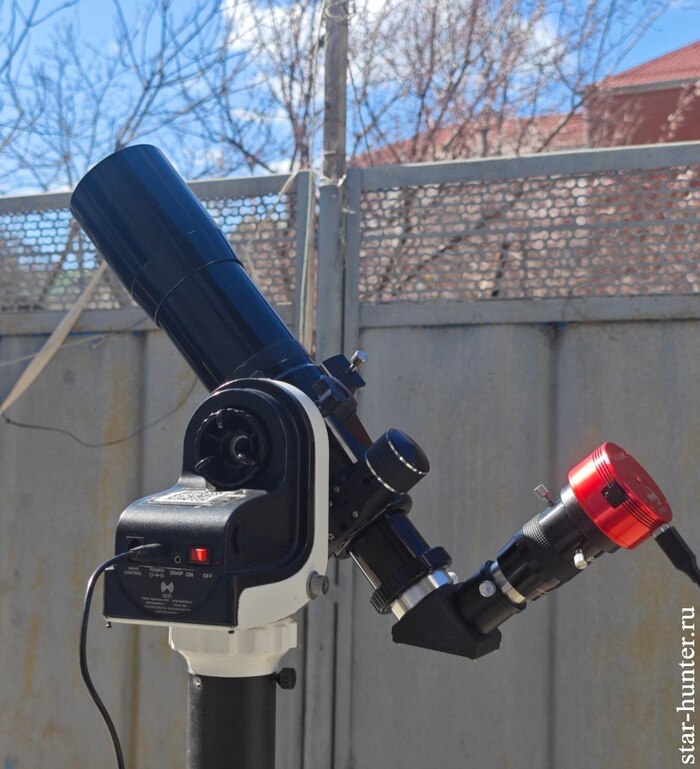 Для съёмки я использовал небольшой линзовый телескоп с диаметром объектива 66 миллиметров, а также астрономическую камеру с увеличителем фокусного расстояния (линза Барлоу 2х).