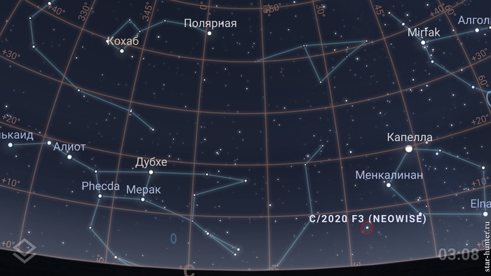 Ниже показана поисковая карта на 10-12 июля (приложение Stellarium Mobile Plus). В качестве ориентира используйте звезду Капелла, а также ковш Большой Медведицы.