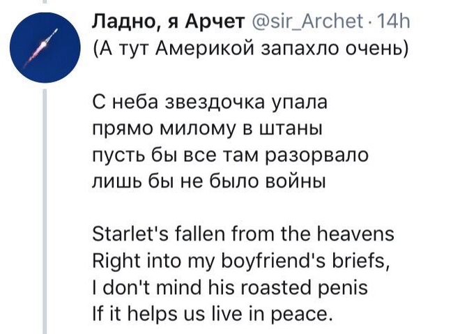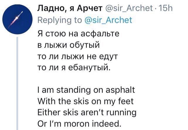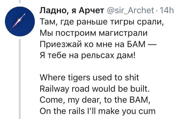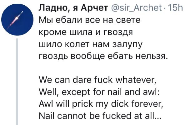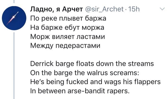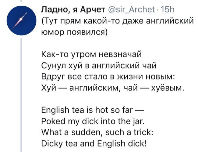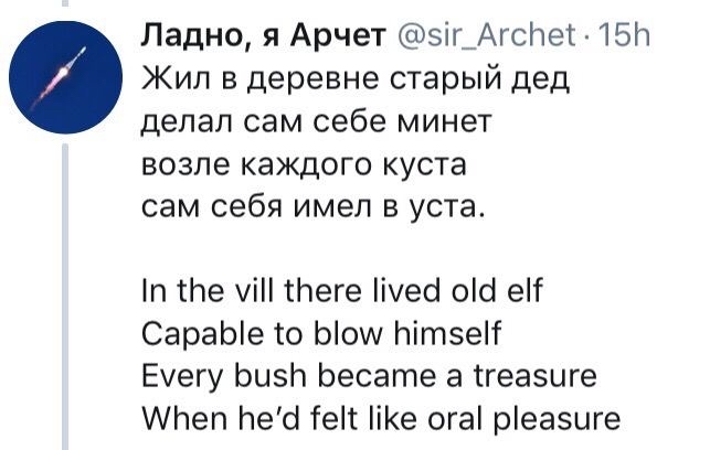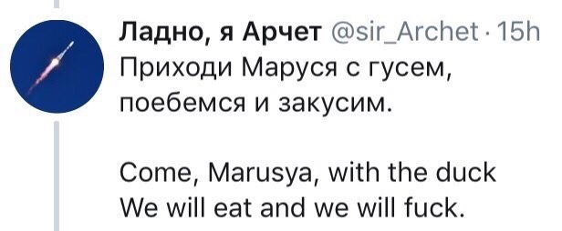 145 Stariy1 Баяны Приходи Маруся с гусем 5 лет назад Показать полностью 9 Юмор Четверостишье Мат Английский язык Перевод Длиннопост Ещё 0