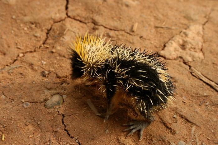 Обитают эти чудесные зверушки на Мадагаскаре и выглядят весьма оригинально для ежа: вытянутая мордочка, острые колючки вперемешку с густой жесткой шерсткой, задние лапки длиннее передних… Окрас тоже необычный — словно на тенрека опрокинулись раскрытые баночки с желтой и черной краской, которая заляпала ежика с головы до ног.