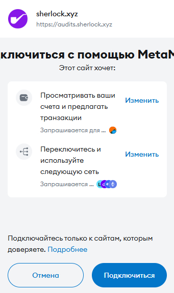 Вы заходите на сайт, нажимаете кнопку регистрации через кошелек, открывается ваш кошелек с сообщением, что такой-то сайт просит подписать сообщение. Это не такое "одобрение", как было описано в предыдущем пункте, а простая валидация сайта, что кошелек принадлежит вам и вы имеете к нему доступ. На скринах ниже приведен пример такой регистрации на платформе для конкурсных аудитов.
