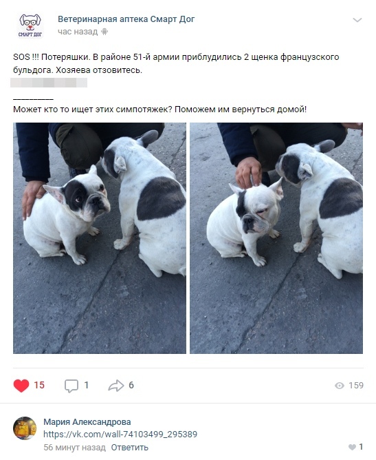 Вот так вот, меньше чем за час, с помощью постов и репостов записей, стало спокойнее и хозяевам, и сотрудникам магазина, и собачкам) Пруф https://vk.com/smartdogsimf бульдожков нашла моя знакомая )) Не теряйте любимцев !!