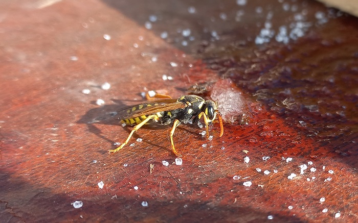 В летний период я бы не задумываясь прихлопнул эту суку, а сейчас смотрел как она барахтается, одуревшая от капризов погоды, беспомощная, одинокая. Совсем как я. Короче в итоге, я перенёс полосатую под солце и дал сахарной водички, начитавшись пикабушных историй про шмелеков. Других угощений на объекте нет, разве что растворимый кофе, но ос в общем не особо привередничал, жрал так что за ушами трещало.