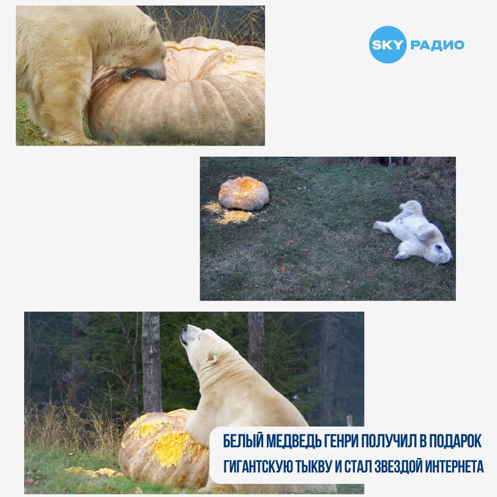 В Канаде белый медведь по кличке Генри, живущий в заповеднике Cochrane Polar Bear Habitat в провинции Онтарио, стал героем дня после того, как с аппетитом расправился с гигантской тыквой весом около 640 килограммов.
