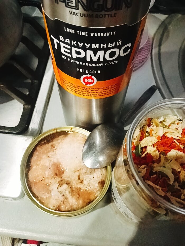 Рекомендую в экстремальных ситуациях в качестве мясной/рыбной составляющей брать для готовки в термосе тушенку, рыбные консервы, баночную ветчину, сухую колбасу. Можно их заложить в термос изначально, либо добавить в уже готовое блюдо – кашу или суп.
