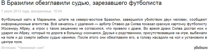 Stepikus 12 лет назад Тем временем в Бразилии ...после этого они обезглавили его, а голову насадили на кол и установили в центре поля Футбол Бразилия Новости