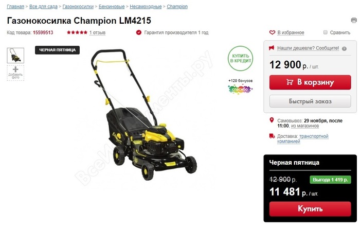 И тут во мне начел просыпаться экономист и зануда, что в целом одно и тоже. Может эта тачка не обычная, стал смотреть характеристики, ан нет, не тебе турбо-дизельного мотора, не карбоновой подвески – корыто с ручками и два колеса. Одно отличие, объем корыта моей тачки 110 литров, а у этой 160л. - 50 литров разница. Ну не могло же уйти метала на 10 000р. больше???? КАК ТАК??? Из чего складывается стоимость??? Ведь за те же деньги можно купить две моих тачки и на остаток нанять двух людей которые этими тачками будут развозить навоз по участку. Да и вообще, как это корыто может стоить дороже той же бензиновой помпы что на картинке или ударной дрель-шуруповерт? Я понимаю, что сравниваю разные вещи. Но у них и производство сложней и деталей много разных и патенты поди на технологию купить надо. Или вот еще газонокосилка.