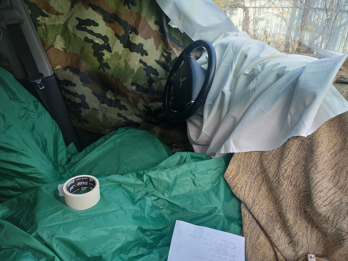 Значит, вводим горячий воздух внутрь. Сколько я ни раздумывал — ничего логичнее и проще, чем ввести через заглушку в боковом окне я не придумал. Ну и поскольку я использую тент-маркизу (Боковой тент-маркиза для автомобиля своими руками) и "выхожу" из машины через задние двери — мне удобнее вводить воздуховоды через окно передней двери. Изготовить заглушку на заднее окно очевидно много проще, но мне очень нужно было на переднее. Извёл зазря немного оргалита, но в итоге получилась пот такая фиговина.