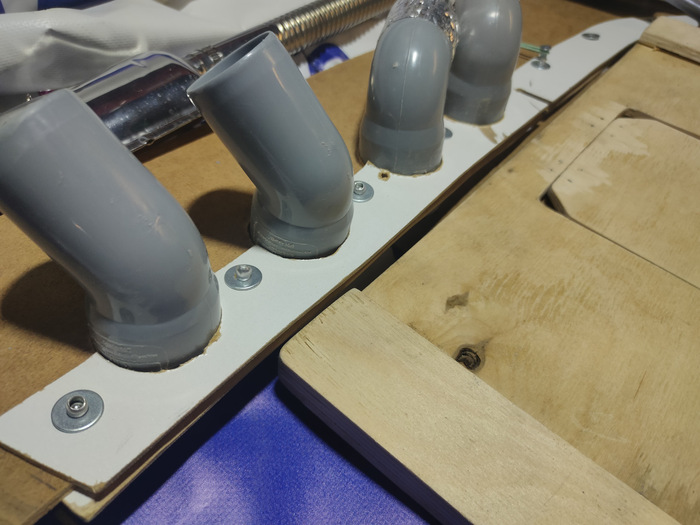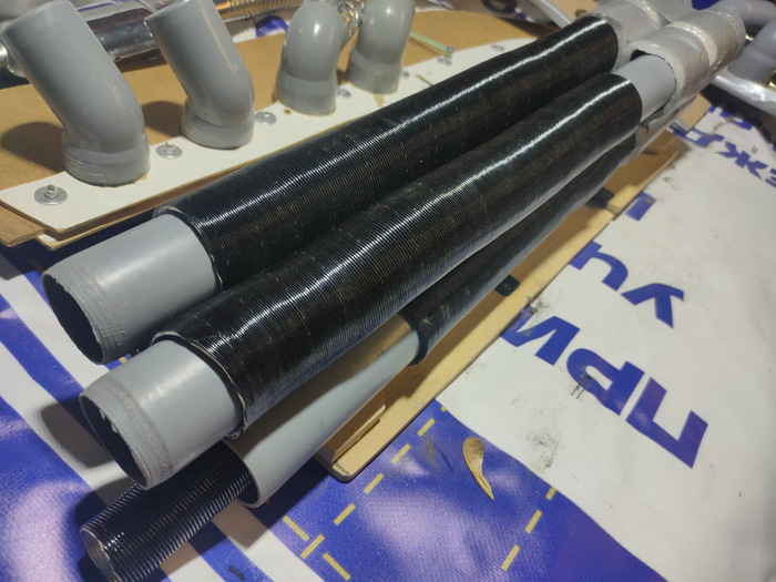 Чтобы не замять комплектные гибкие воздуховоды в процессе перевозки, я надеваю их на ПВХ-трубы, которые хранятся вставленными в такой вот обойме из трубного утеплителя: не рассыпаются и удобно доставать.