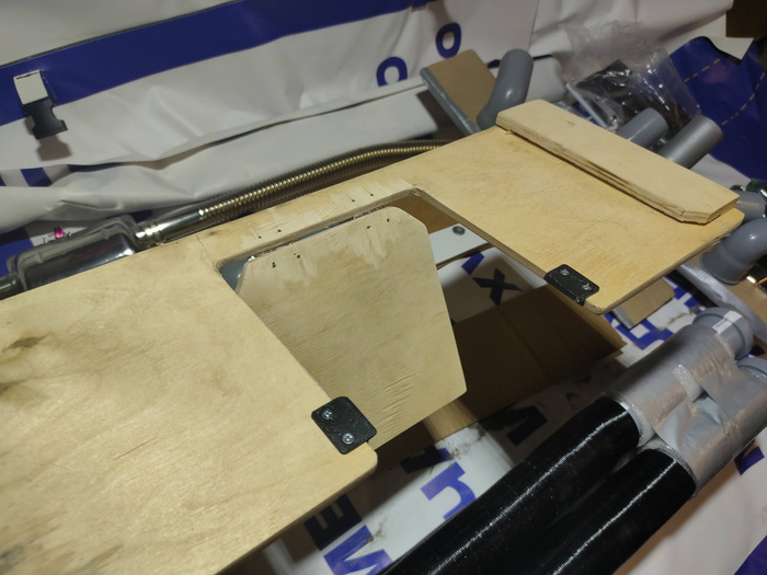 Чтобы не тянуть длинные воздуховоды снизу, с уровня земли, и не иметь проблем с размещением в сухой траве, отопитель закрепляем прямо возле стекла. Изготовлена высокотехнологичная "фанерка", в которую он задвигается своими ножками (чтобы снималась и он не занимал лишнее место в багажнике), плюс в ней сделана эдакая надуманная откидная "дверка", чтобы горячая труба выхлопа уж точно не поплавила пластиковый молдинг вдоль стекла, даже случайно.
