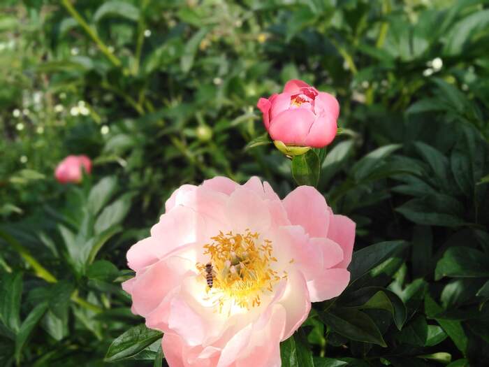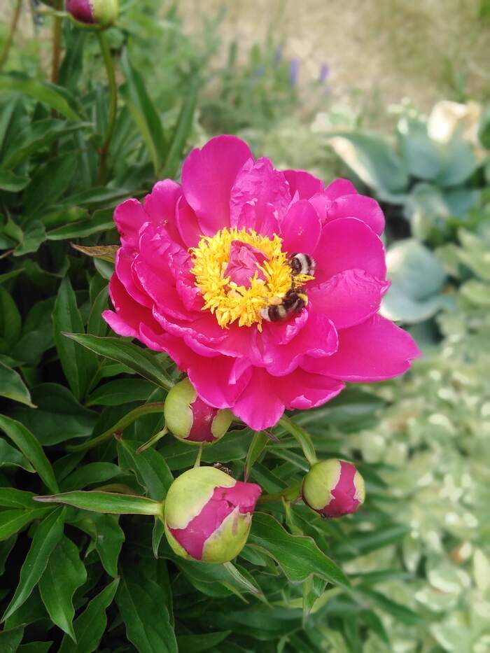 Не помню сорт этих пионов. У них листва темнее и черенки красноватые. Этот сорт особенно любят пчелки и шмели.