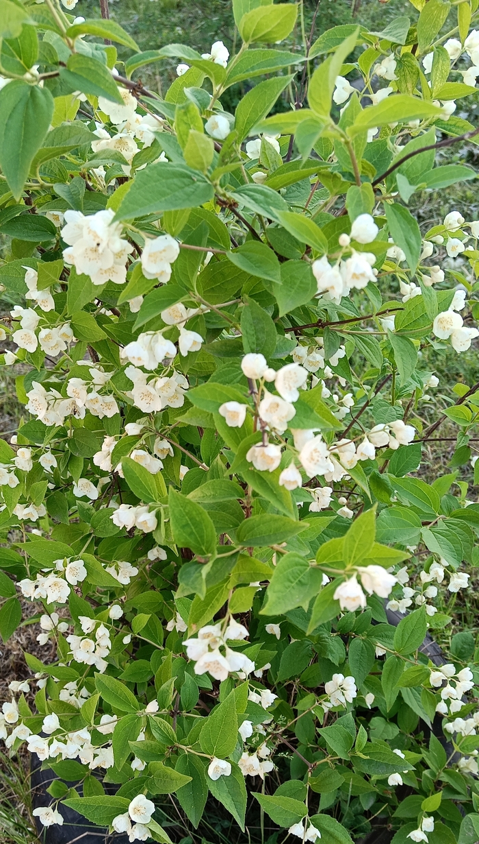 Это чубушник. Простой сорт. Бывают махровые сорта и, даже, с разными ароматами. Мой пахнет жасмином. Этот кустик ещё подросток. Да и земля у дороги не слишком плодородная. Поэтому и растет медленно, и лист светлый. Но отросток я брала у куста, который жил на плодородной почве. Он был почти 3 метра высотой и цвëл только по периферии куста, так как середина была загущена.