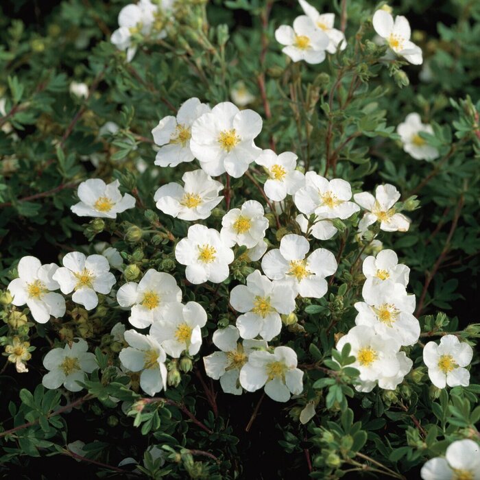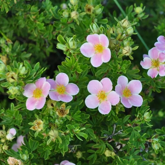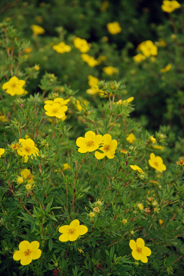 Лапчатка или Курильской чай. Бывают сорта высокие и низкие. Цветы белые, оранжевые, красные, жёлтые с различными оттенками. Лучше формировать, иначе куст получается растрëпаным. У меня растёт на солнечной стороне.
