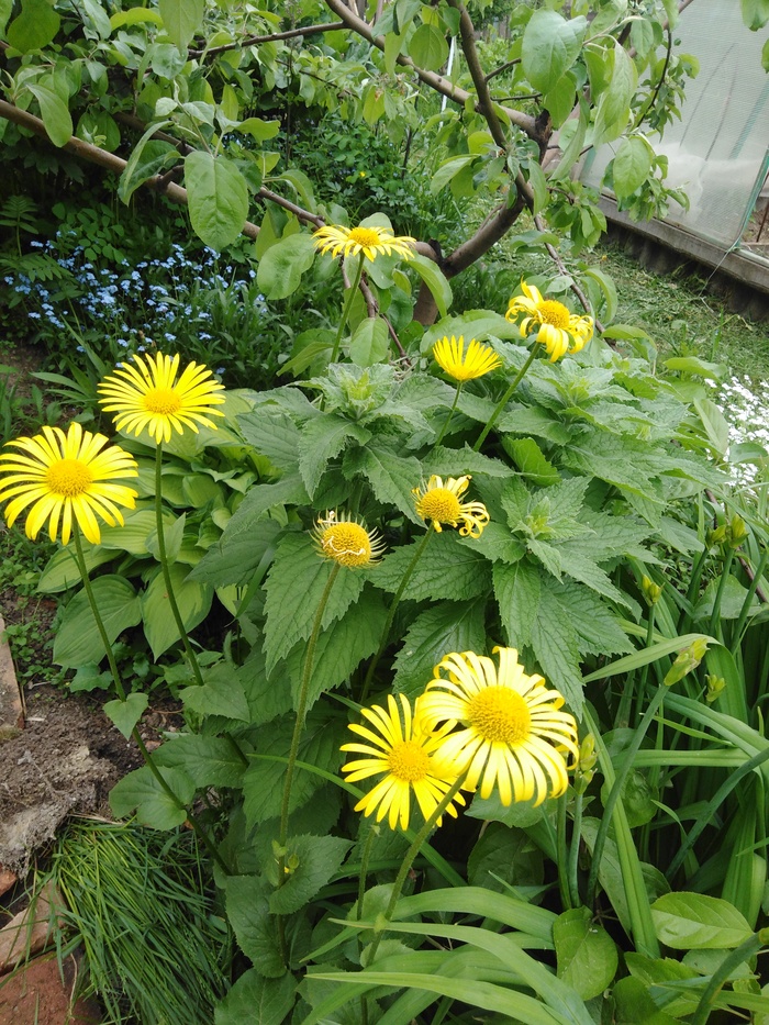 Дороникум. Большие ярко-жёлтые ромашки. На заднем плане готовятся цвести колокольчики.