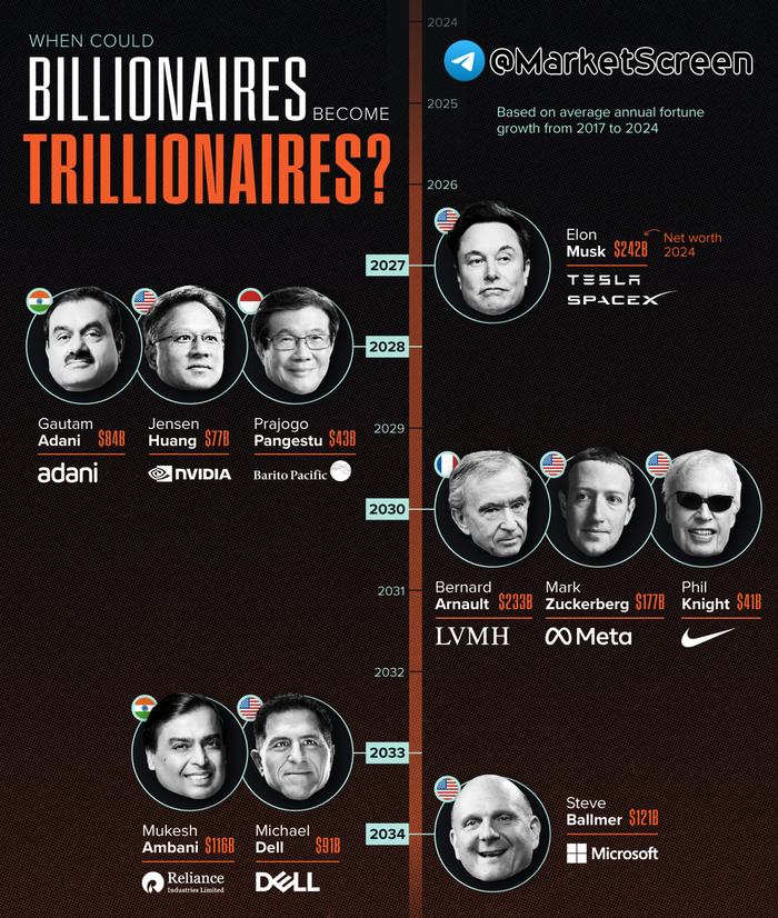 Короче, Informa Connect Academy Informa проанализировала данные о чистом состоянии 30 самых богатых людей за период с 2017 по 2024 год. Были рассчитаны среднегодовые темпы роста их состояния и составлен прогноз на ближайшие 30 лет, чтобы предсказать, когда появятся триллионеры.