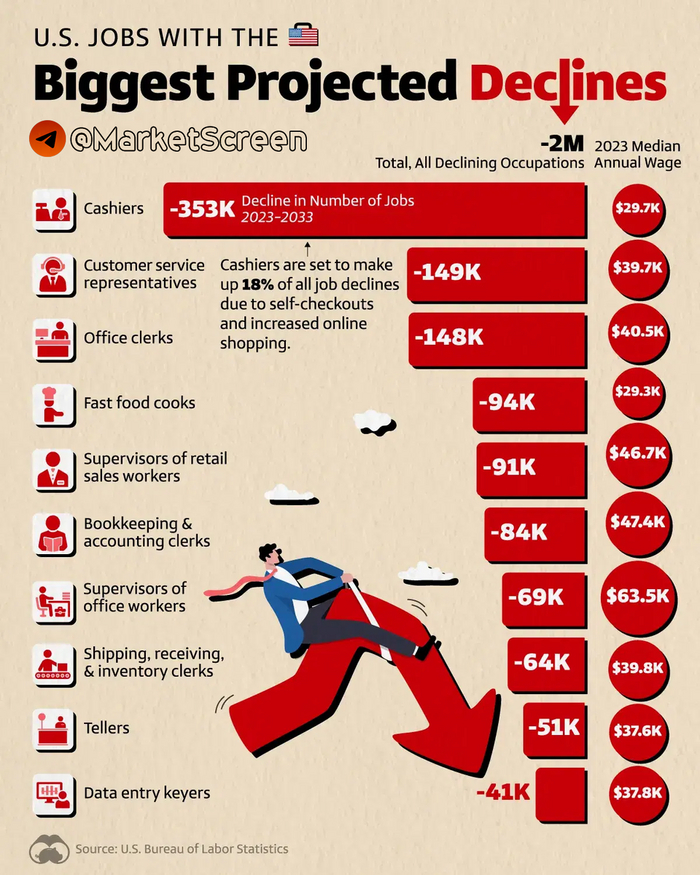 Профессии с наибольшим ожидаемым сокращением рабочих мест.